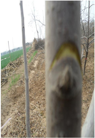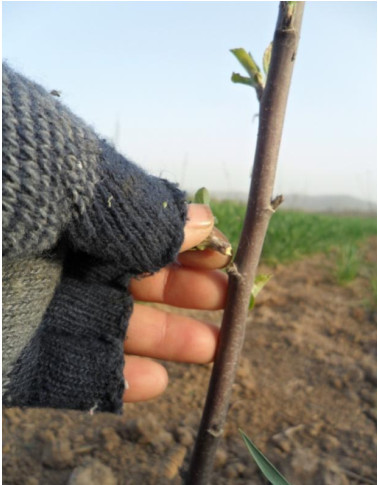 2)抹芽。栽植当年定干发芽后,由定干处向下20厘米内的芽子保留,作为整形带促发枝条,距地面20厘米以内苗干上的芽萌发后抹掉,不让其发枝,节省养分,培养光滑的主干(图2)。