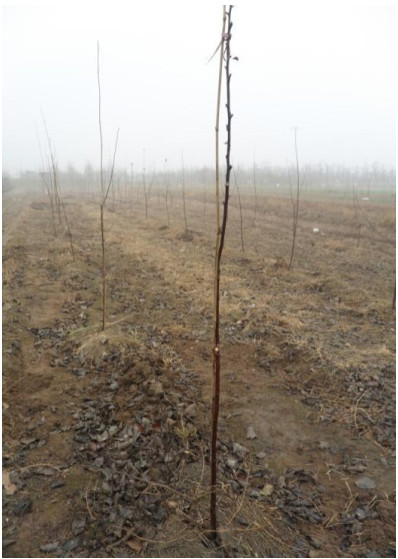 6)冬季修剪。第一年冬季修剪很简单,中心干生长强旺的(甩放)不动,中心干生长中庸、较弱的都在饱满芽处进行短截(一般为中心干2/3长度)。其余的枝条全部采用马蹄形修剪,剪掉枝条,培养一个强壮的中心干,并用竹竿扶直(图3)。