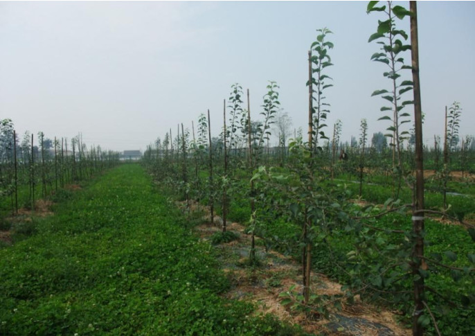 6)做好土肥水管理工作。一年施肥3次,分别在3月萌芽前进行,以氮肥为主,6月以磷肥为主,9月以有机肥为主。果园进行生草制和覆盖制,行间种植白三叶草(图7)、鼠毛草、黑麦草、小冠花、花卉等,树盘下覆盖农作物秸秆(图8)。