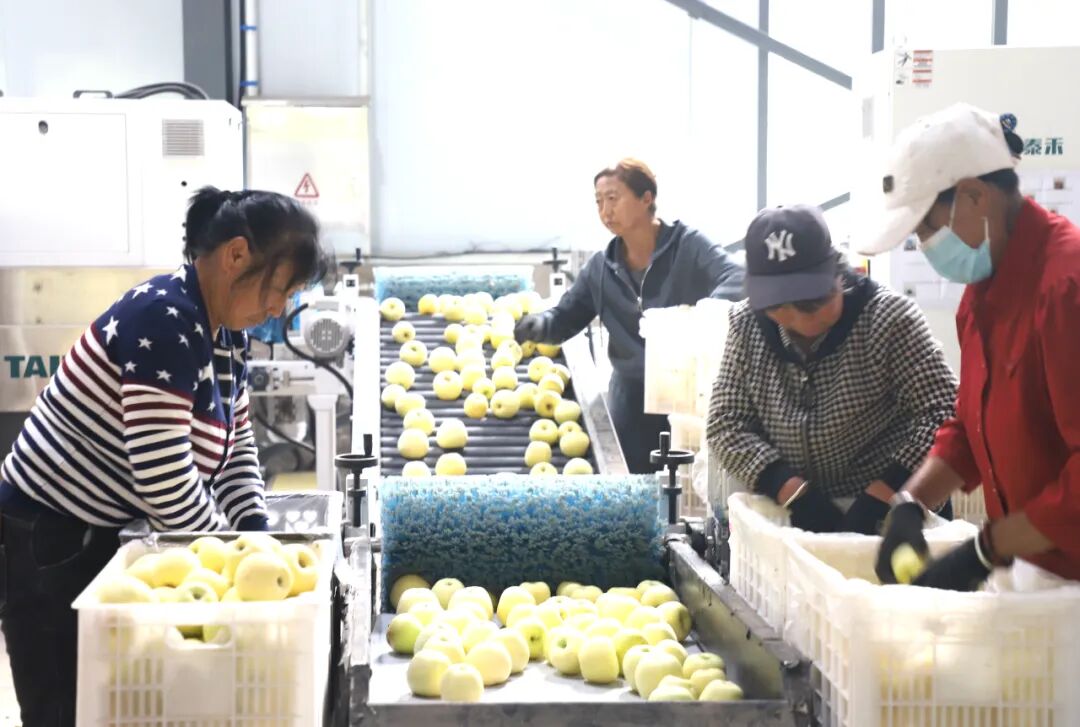 近日,绥德县赵家坬村山地苹果“黄元帅”的包装现场,8条智能选果线正在运转,通过传送带将选出的大小合格、品质好的果子运至装箱线,工人们熟练地给果子套网、再装箱、封口、搬运,一派热火朝天的繁忙景象。