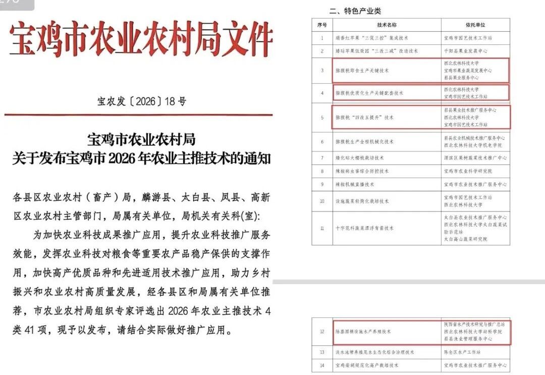 近日,宝鸡市农业农村局公布2026年农业主推技术名单,眉县猕猴桃即食生产关键技术等4项农业生产技术入选全市农业主推技术。