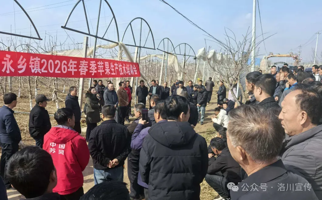 近日,洛川县永乡镇2026年春季苹果生产技术田间培训会在阿寺村矮化密植示范园举办。县苹果产业管理局、县苹果生产技术推广服务中心、永乡镇等单位负责人和该镇400余名果农代表参加培训活动。