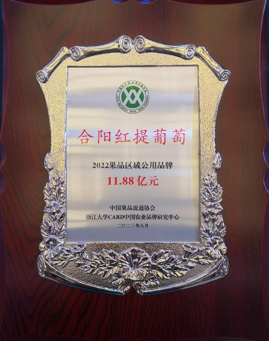 8月3--4日,2023年“第八届中国果业品牌大会暨全国果业知名品牌展销会”在上海盛大举行。会上,由中国果品流通协会和浙江大学CARD农业品牌研究中心发布《2022果品区域公用品牌价值报告》,合阳红提葡萄荣登第八届中国果业品牌大会品牌榜,果品区域公用品牌价值达11.88亿元,较2021年增加3.55亿元,增幅42.6%。