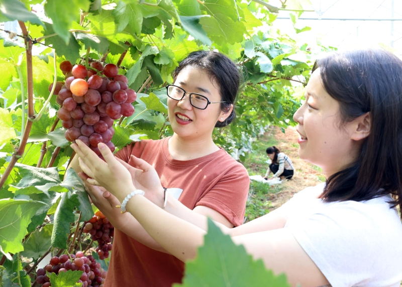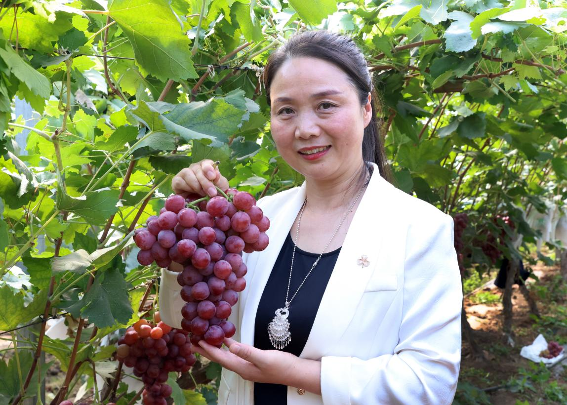仲秋,一串串紫钻般的果实垂挂在绿藤之下,绿藤红果相互映衬,种植户们穿梭在基地里采摘、搬运,到处呈现一片繁忙的景象。