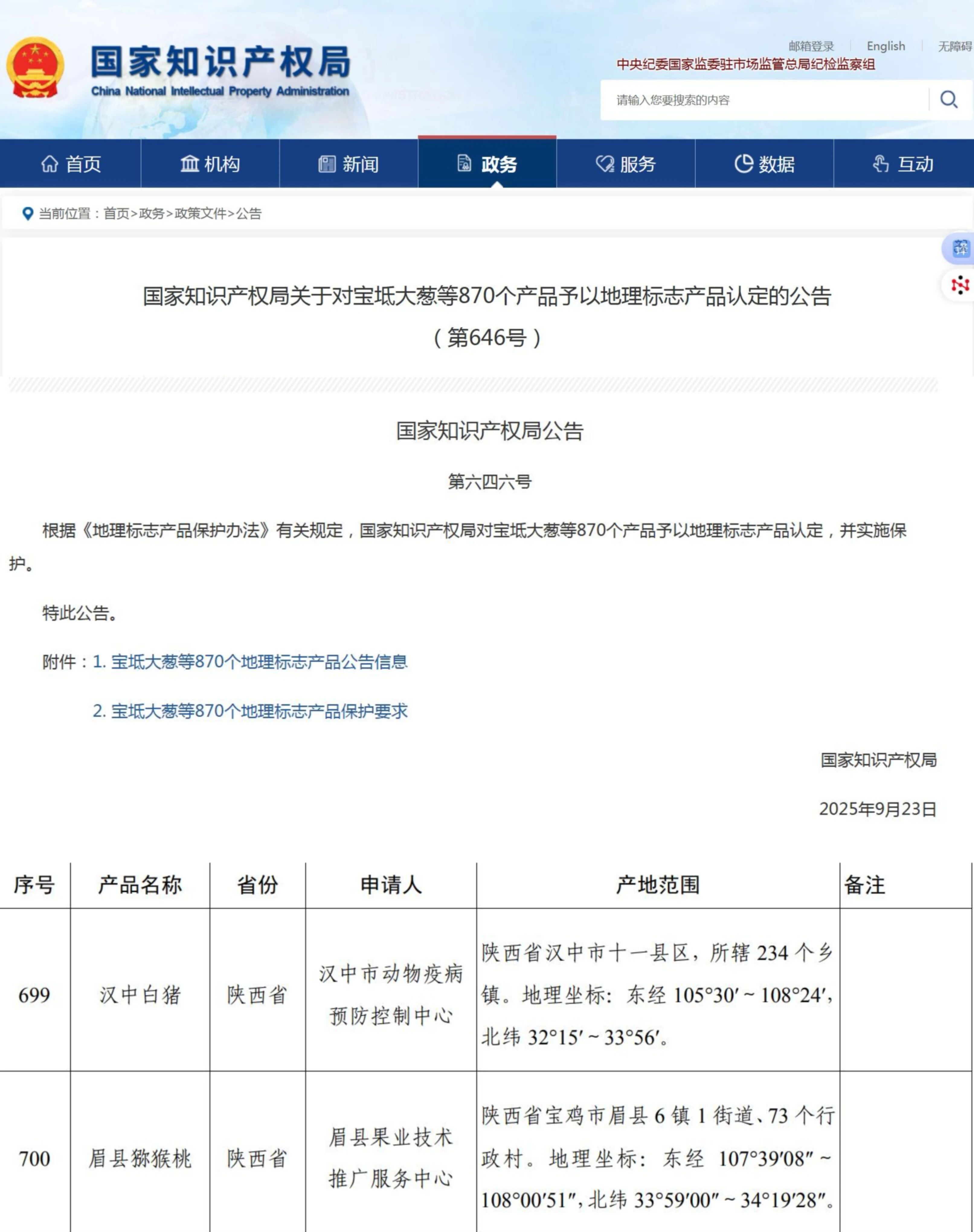 近日,国家知识产权局发布第六四六号公告,对全国870个产品予以地理标志产品认定,眉县猕猴桃名列其中。眉县猕猴桃自2010年登记为国家农业部农产品地理标志以来,全面推广猕猴桃“十大标准化生产技术”和“四改五提升”技术,不断优化产业结构,延伸产业链条,推进品牌效应,先后获得“国家级农产品地理标志示范样板”、“全国名特优新农产品”等荣誉,并入选首批100个受欧盟保护地理标志农产品名单,地理标志品牌价值达161.37亿元,位列全国地理标志产品猕猴桃品牌第一。