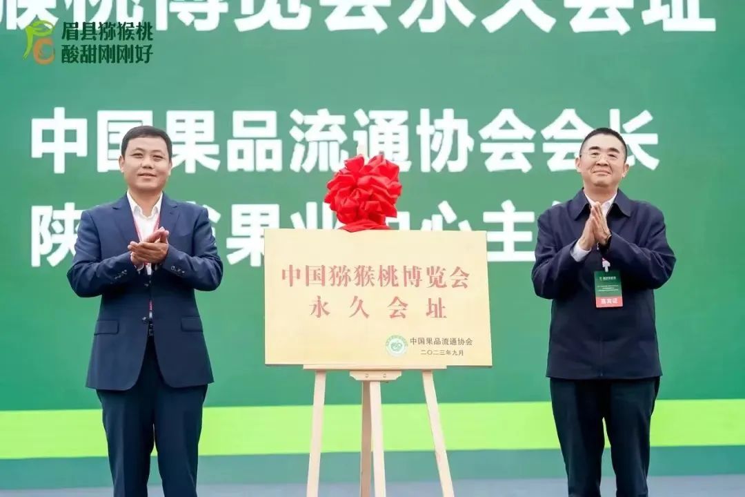9月22日,在宝鸡市庆祝2023年中国农民丰收节暨猕猴桃产业发展大会开幕式上,中国果品流通协会会长鲁芳校、陕西省果业中心主任赵广柱共同为中国猕猴桃博览会永久性会址揭牌。